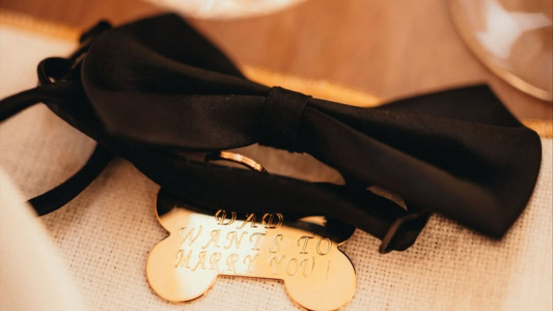 Chiar animalul a dezvăluit intenţiile stăpânului său stăpânei sale prin intermediul zgărzii sale aurii, gravată special pentru această ocazie. Şi, în timpul cinei, Leo a primit şi el desertul său: un mic tort în formă de os cu inscripţia „Mami a spus da”.