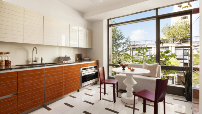 Bucătăria deschisă dispune de mobilier realizat la comandă, blaturi din cuarțit elvețian și electrocasnice de lux. Apartamentul are două dormitoare principale, ambele cu dressinguri walk‑in spațioase și băi în stil spa, placate cu marmură italiană. Mai există alte două dormitoare, mai mici, fiecare cu baie renovată. Cabinele de duș sunt prevăzute cu perdele. O a cincea cameră poate fi folosită pentru oaspeți ori ca birou, bibliotecă sau cameră pentru copii.