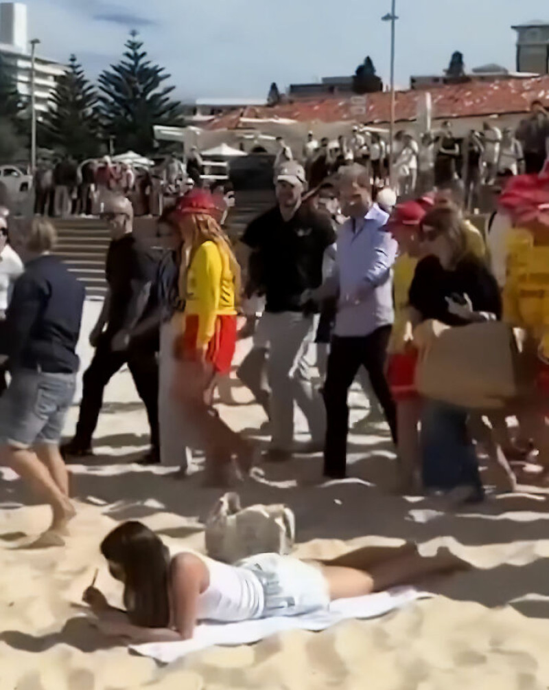 Spre deosebire de ceilalți oameni aflați pe plajă, care s-au dat la o parte sau au încercat să interacționeze cu cuplul, femeia nu a ridicat privirea și nu s-a mișcat. Harry, Meghan și întreaga suită au fost nevoiți să ocolească. Prințul a observat momentul, a râs și a semnalat celor din jur să nu o calce.
