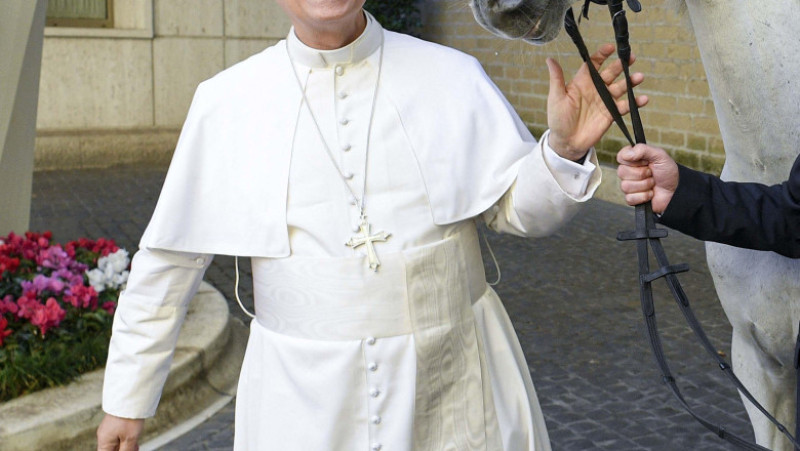 Imaginile date publicităţii de Vatican îl arată pe liderul Bisericii Catolice, înaintea audienţei sale generale de la Vatican, mergând alături de calul alb, ţinându-l de frâie vizibil relaxat.