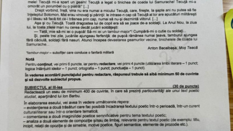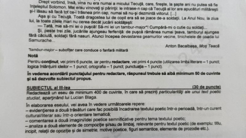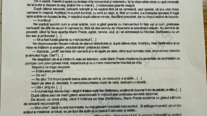 La primul subiect, bazat pe textul „Manuscrisul furat” de Mircea Micu (despre Marin Preda), elevii au avut de argumentat dacă o farsă poate sau nu să aibă consecințe grave, raportându-se atât la text, cât și la experiența personală.