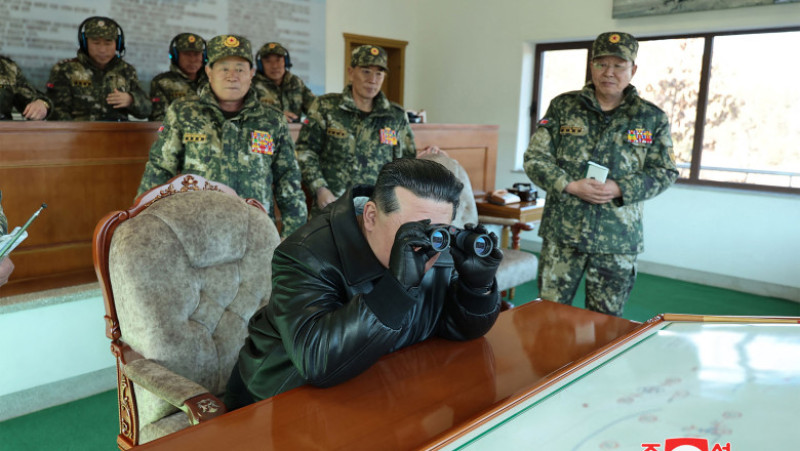 Purtând o jachetă de piele neagră, Kim Jong Un a vorbit cu soldaţi în uniforme de camuflaj şi puternic înarmaţi, a supravegheat exerciţii de tragere şi a inspectat arme, potrivit imaginilor publicate de agenţia de presă oficială KCNA.